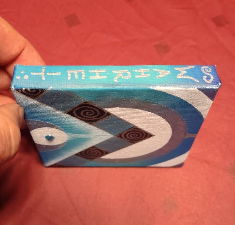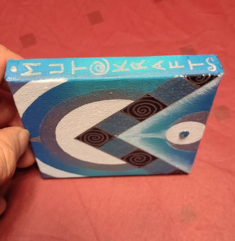 Es hatte auf allen vier Seiten und auf der Rückseite eine Aufschrift. Ich nahm diese zwar wahr, konnte aber zu dem Zeitpunkt nicht wirklich was damit anfangen. Ich stellte das Bild zu Hause neben meinem Computerbildschirm so rum auf, wie mir das Bild gefiel.